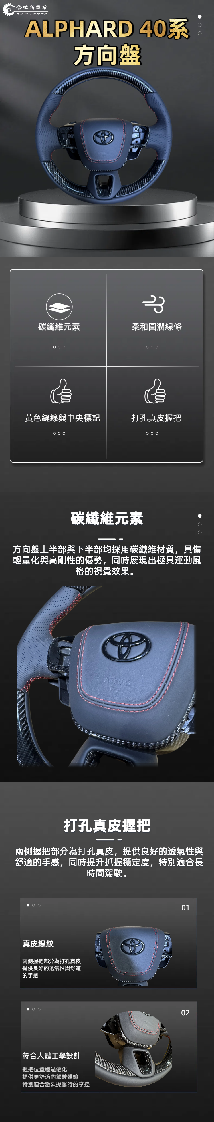 打孔真皮握把:兩側握把部分為打孔真皮,提供良好的透氣性與舒適的手感,同時提升抓握穩定度,特別適合長時間駕駛。